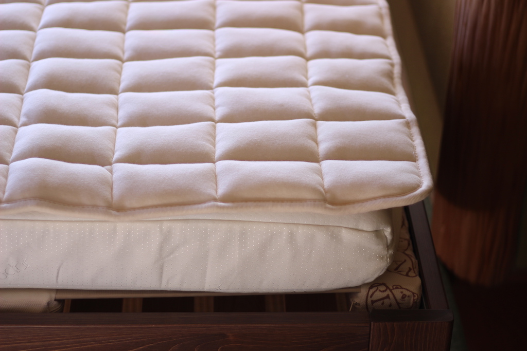ベッドパッドはビラベックの1.5kgタイプ。BOXシーツはとりあえずコットンニットで様子を見て、これでも冬場寒ければキャメルの敷毛布などを検討していただきます。