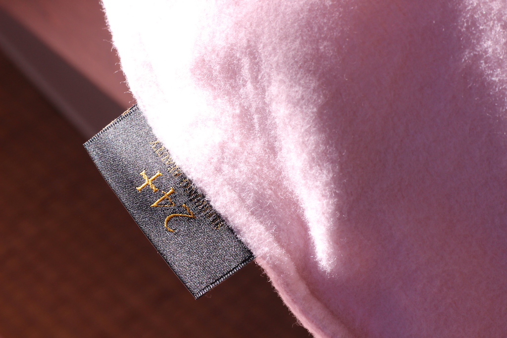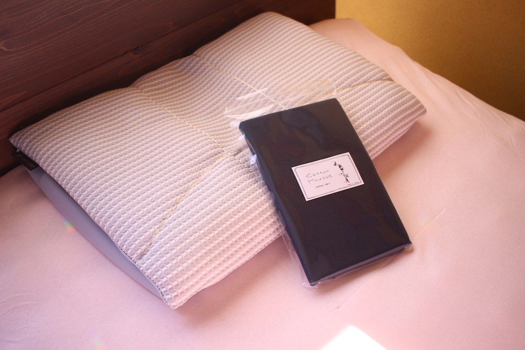 枕はオーダーメイド枕、ピローケースはムースニット。ニットのふんわり柔らかい風合いが心地いいですね。