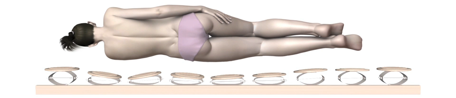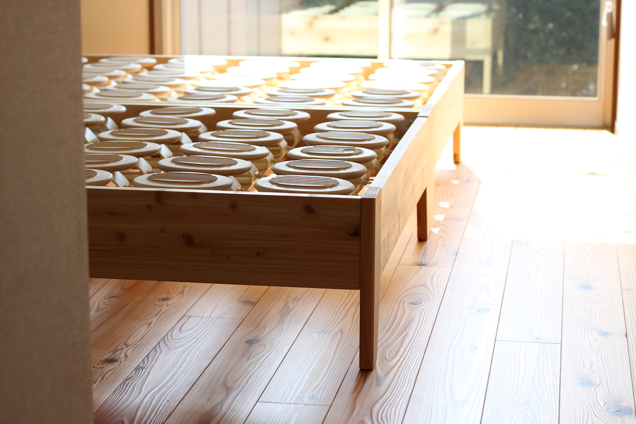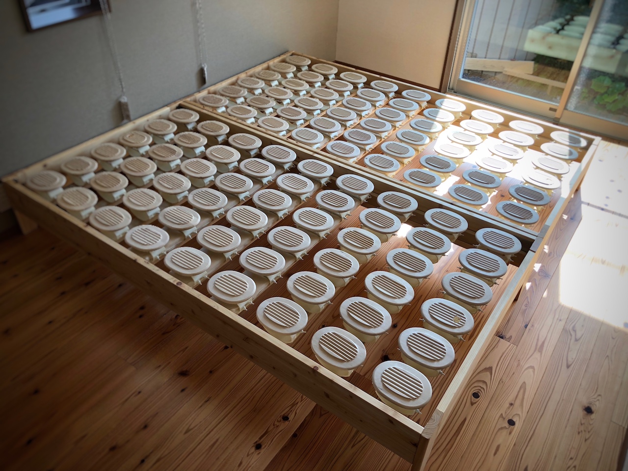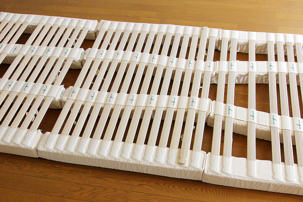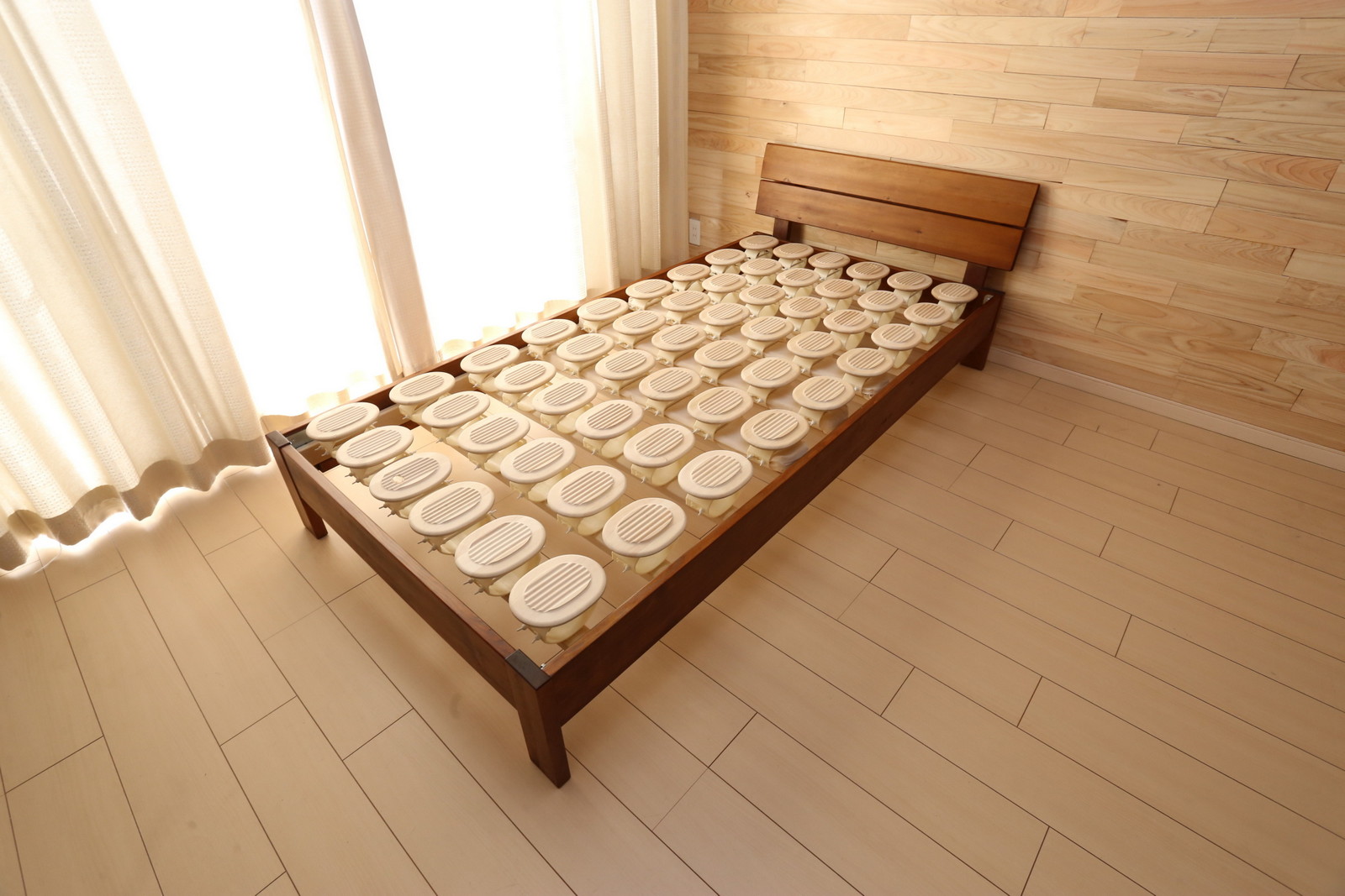 円盤状のクッションは一つ一つ細かく硬さの調整ができるようになっていて、沈ませたいところ、支えたいところを個別に設定できます。金属のスプリングか、木のスプリングかという違いはありますが、ポケットコイルの上位互換的存在と言えますね。