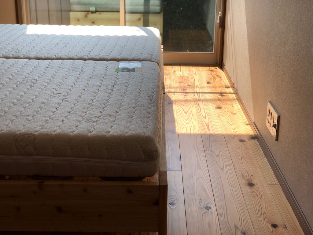 さてこちらは箱ベッドTYPE1にRELAX2000をセットした状態の写真。ここがエルゴノミクスゾーンです。ナチュラルなベッドフレームがM様宅の無垢の床材にマッチしていますね。