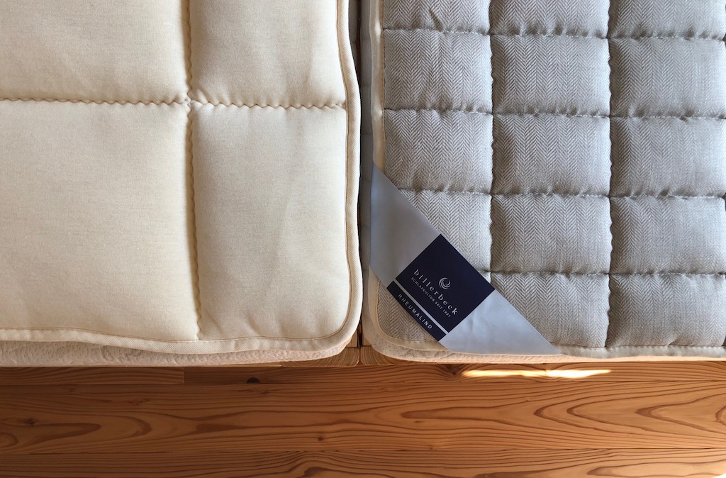ベッドパッドはお二人で違うものをお使い頂きます。暑がりでマットレスの表面に硬さを求めるご主人は、オモテ面にヘリンボンの麻生地が使用されているビラベックの1.5kgタイプを。寒がりの奥様には断熱性がより高いビラベックの厚手タイプ(3.2kg)を。