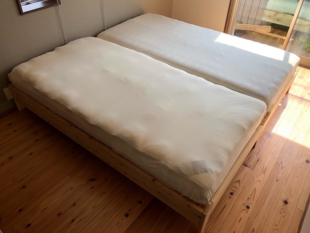 背骨を真っ直ぐにするというような寝姿勢の部分は土台となる木のスプリングが受け持ち、脳に快適と感じさせる感覚の部分は上に乗せるマットレスが受け持つということです。