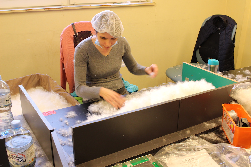 工場内は撮影禁止だったが、ANIMEX社のはからいで『手選別ステッキーホワイトマザーグースダウン98%』の仕上げをしているところを撮影させて頂くことができた。これは手作業で良いダウンだけを選別していく地道で過酷な作業だ。