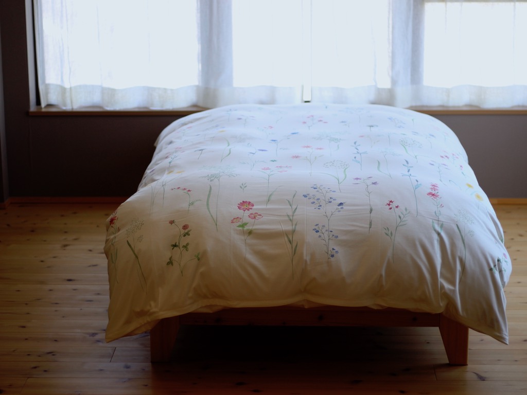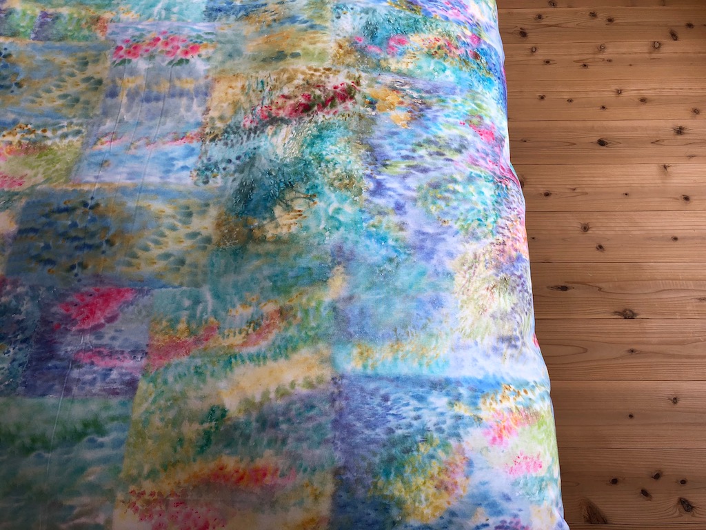 ドイツ製のジャージー生地のカバーです。紐どめしなくても布団にピタッと吸い付き、ズレません。カバーの革命と評される逸品です。
