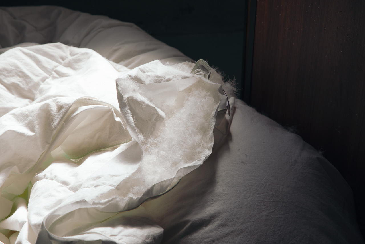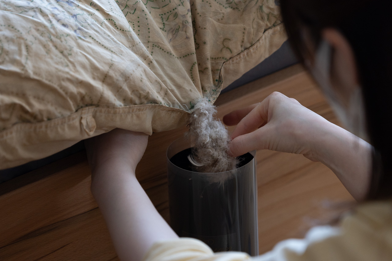 羽毛布団の生地は非常に丈夫な生地ではありますが、汗や皮脂が染み込んだ状態で長年使用しているとピリッと裂けてしまい、羽毛が出てくることがあります。中には「羽毛が大量に減ってしまった!」とショックを受ける人もいらっしゃいますが、大量に出ているように見えても実際には数グラム〜数十グラム程度のロスのことがほとんどです。羽毛の状態さえ良ければ、何ら問題なくリフォームできますのでご安心ください。