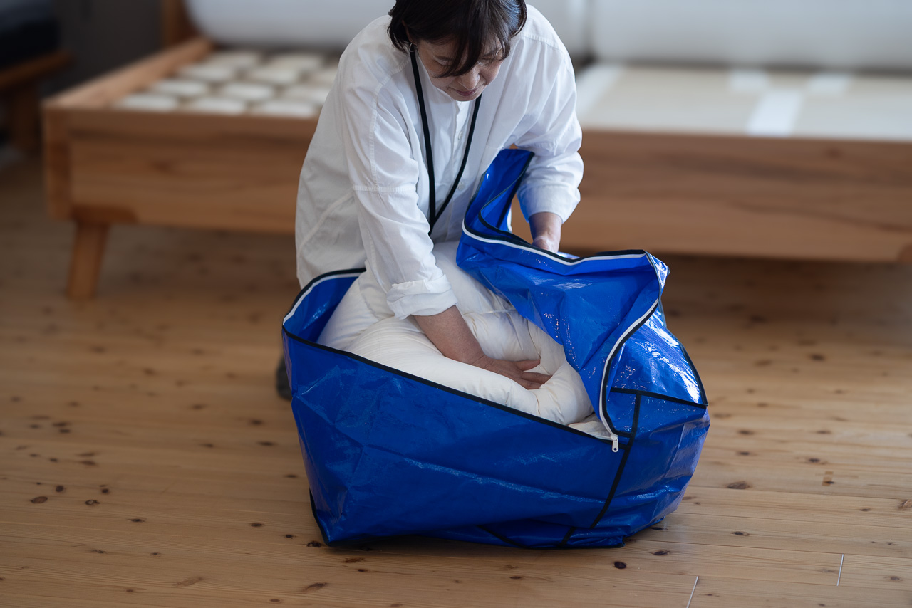 配送バッグが到着しましたら、羽毛布団を中に入れ、当店までお送りください。