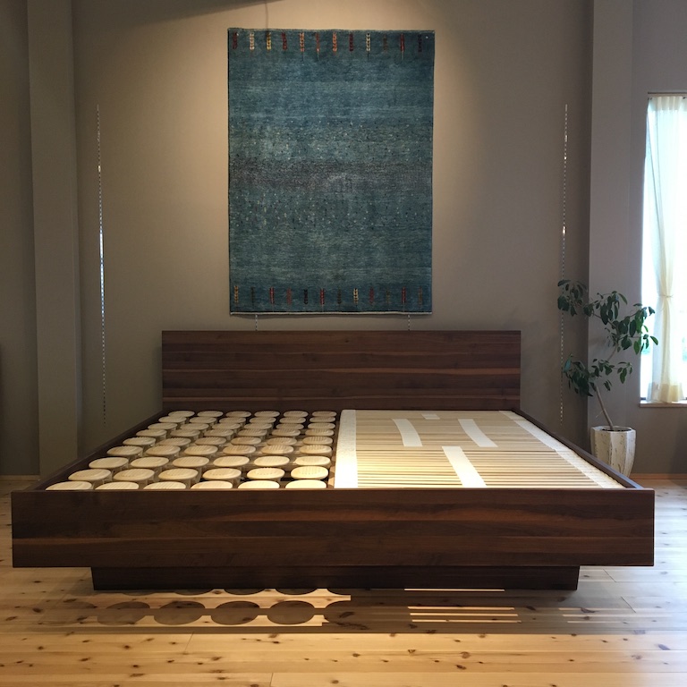 ナチュールフレックスの場合は5.5mm厚のスラット(写真左)と9mm厚(写真右)のスラットがほぼ半々で使用されているため、場所によってスラットの厚みを入れ替えることで硬さの調整が可能です。