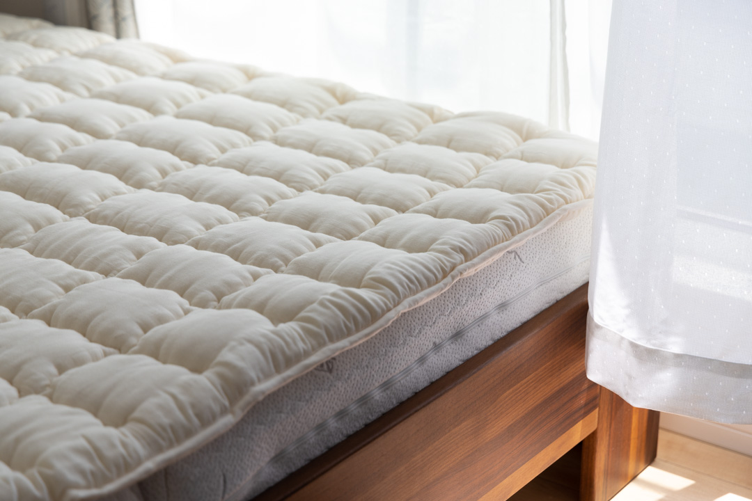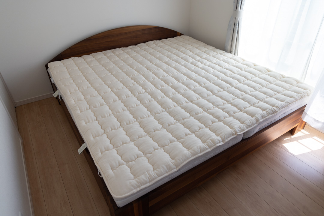 マットレスの上にはkaiminyaオリジナルのウールベッドパッドをセットさせて頂きました。ワイドキングサイズなので、2枚のマットレスを1枚のベッドパッドで覆うことができ、マットレス同士の境界が気になりません。
