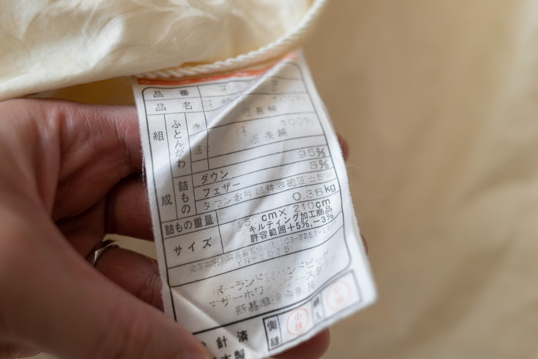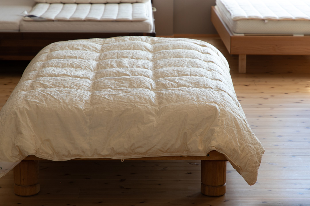 どちらの布団もミシンを使わない、熱融着タイプのキルトが採用されています。一般的な羽毛布団はマチ布をミシンで縫って固定しますが、こちらの布団たちはミシンの代わりに接着剤でマチ布が固定されています。