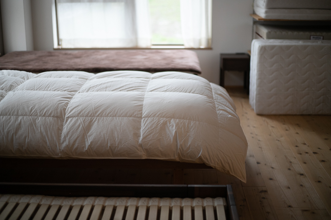 最近はコストを削減するために羽毛の量を減らしているメーカーが目立ちますが、我々の羽毛布団はコストカットのために羽毛の量が少ないのではなく、この量で十分だから900gで仕上げています。ここには大きな違いがあります。