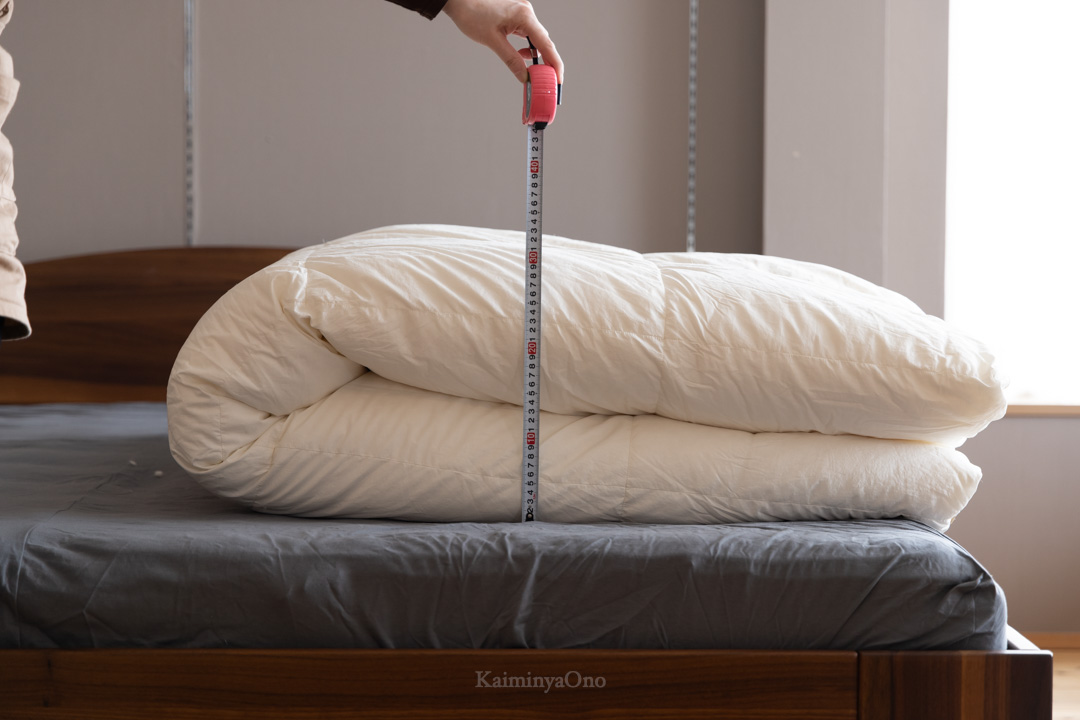 四つ折りの状態で厚みを測ってみましたが、30〜35cmほどの厚みになっており、冬用として考えるとやはり物足りない印象です。