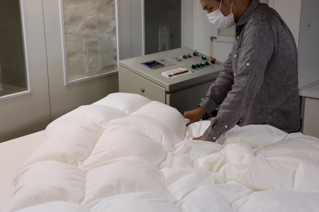 羽毛の洗浄・除塵と、生地の縫製が完了すればあとは羽毛を吹き込むだけ。ノズルを入れて1マスずつ丁寧に吹き込みます。両サイドに比べて中央3列は少し多めに羽毛を充填し、傷みやすい部分がより長持ちするように工夫します。(羽毛は空気と共にマスの中に吹き込んでいくわけですが、通気度の高い生地と低い生地とでは空気の抜けが違うんですよね。)